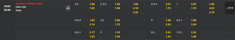 Tại kèo châu Á, nhà cái đưa ra tỷ lệ kèo cho trận đấu giữa America MG vs Colo Colo là 0.5 FT. Trong đó, đội chủ nhà America MG sẽ là đội bóng chấp và ngược lại, đội khách Colo Colo sẽ là đội chấp.