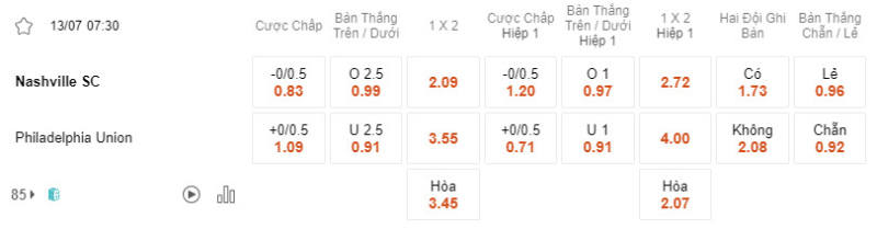 Tại kèo châu Á, nhà cái đưa ra tỷ lệ kèo cho trận đấu giữa Nashville vs Philadelphia Union là 0-0.5 FT. Trong đó, đội chủ nhà Nashville được đánh giá cao hơn nên sẽ là đội chấp và ngược lại, đội khách Philadelphia Union sẽ là đội được chấp.